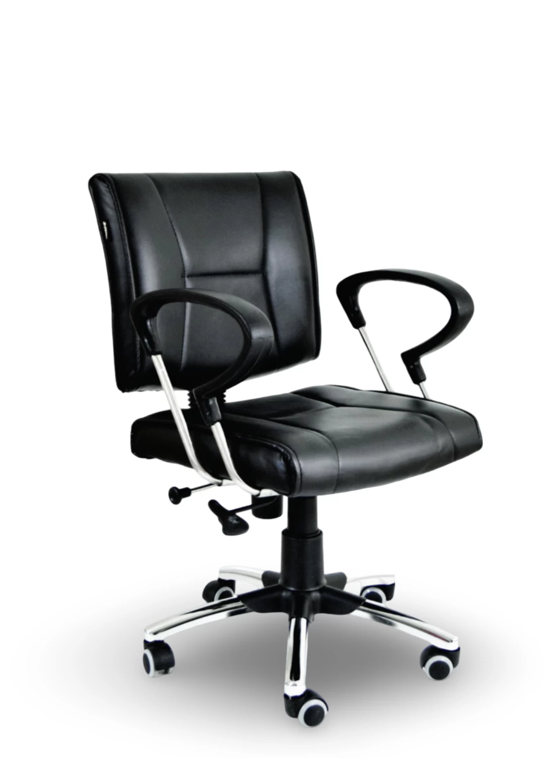 The foam cushioned seat and back, along with leatherette upholstery, provide comfort and style for long hours of work. The PU armrests add extra support, while the pushback mechanism with one position lock allows for customizable comfort. The chrome plated heavy base with nylon castors ensures durability and easy mobility around your workspace.