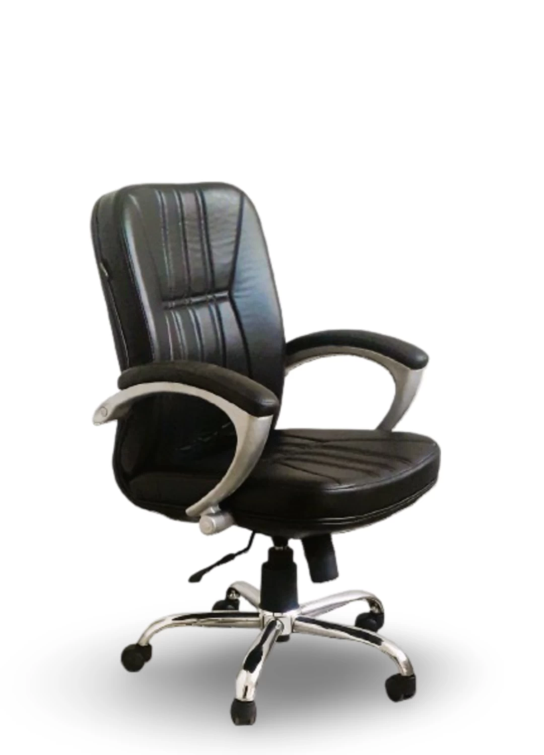 Designed for both comfort and durability, this chair features a foam cushioned seat and back, ensuring a cozy and supportive experience throughout your workday. The leatherette upholstery adds a touch of elegance, while the cushioned armrests provide extra relaxation. With its tilt mechanism and one position lock, you can easily find the perfect angle for your needs. The chair is built on a chrome plated heavy base, equipped with nylon castors for smooth mobility.