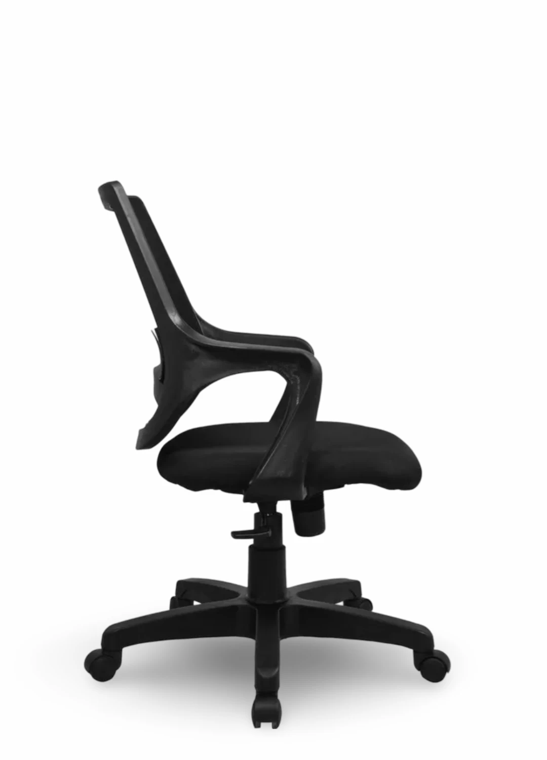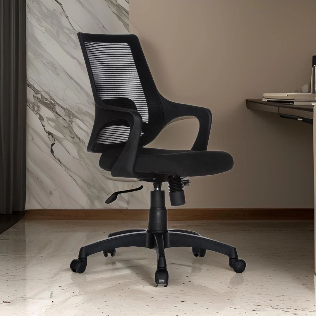 Upgrade your office space with this sleek black office chair featuring a comfortable foam cushioned seat and breathable mesh back for all-day support. The chair is equipped with PP arms for added comfort and a synchro-tilt mechanism for customizable reclining. Easily adjust the height with the gas lift feature and move around effortlessly with the nylon castors. Perfect for long hours of work or study, this chair combines style and functionality for a productive workspace.
