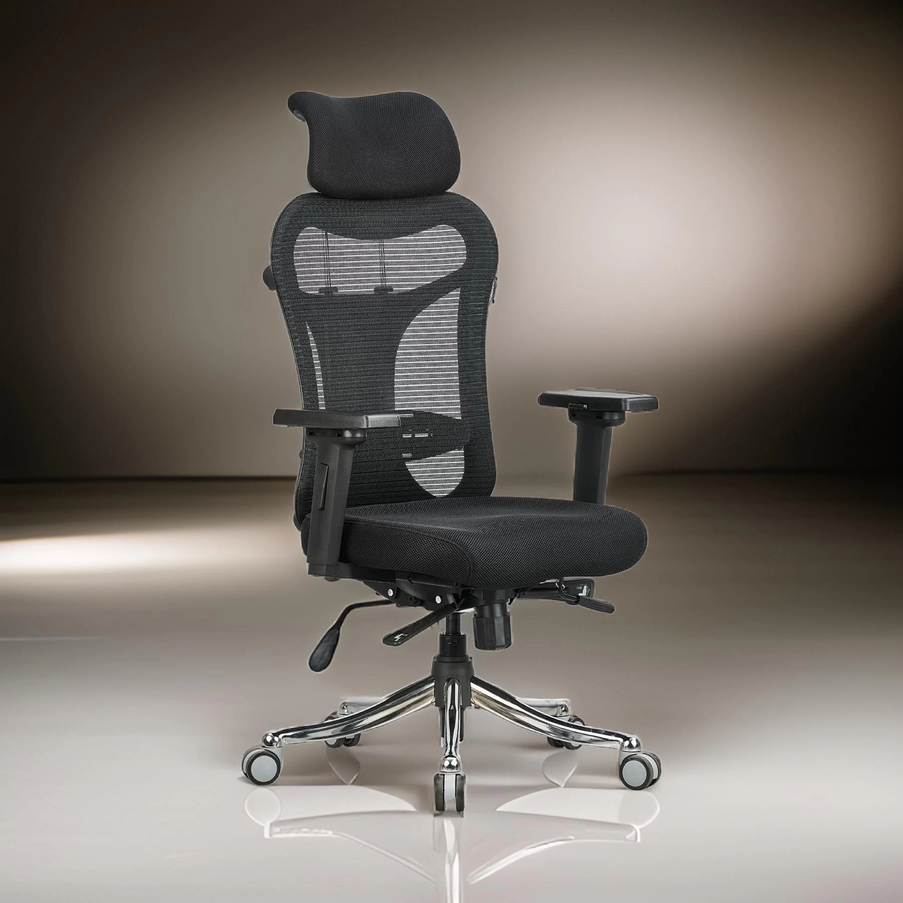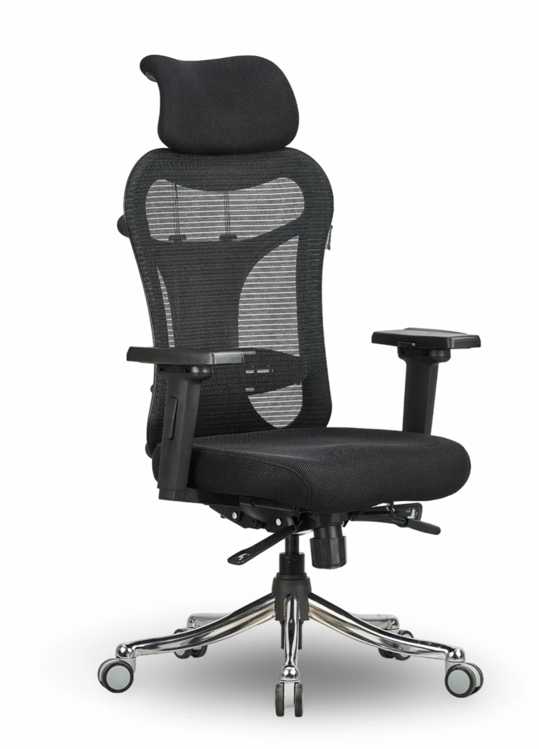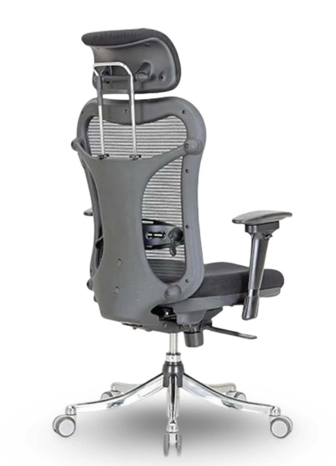 - Upgrade your office space with our Sleek and Functional Ergonomic Chair with a mesh back and arms. This ergonomic chair Features a glass filled Nylon backrest with height adjustment, providing optimum support for your back and spine.